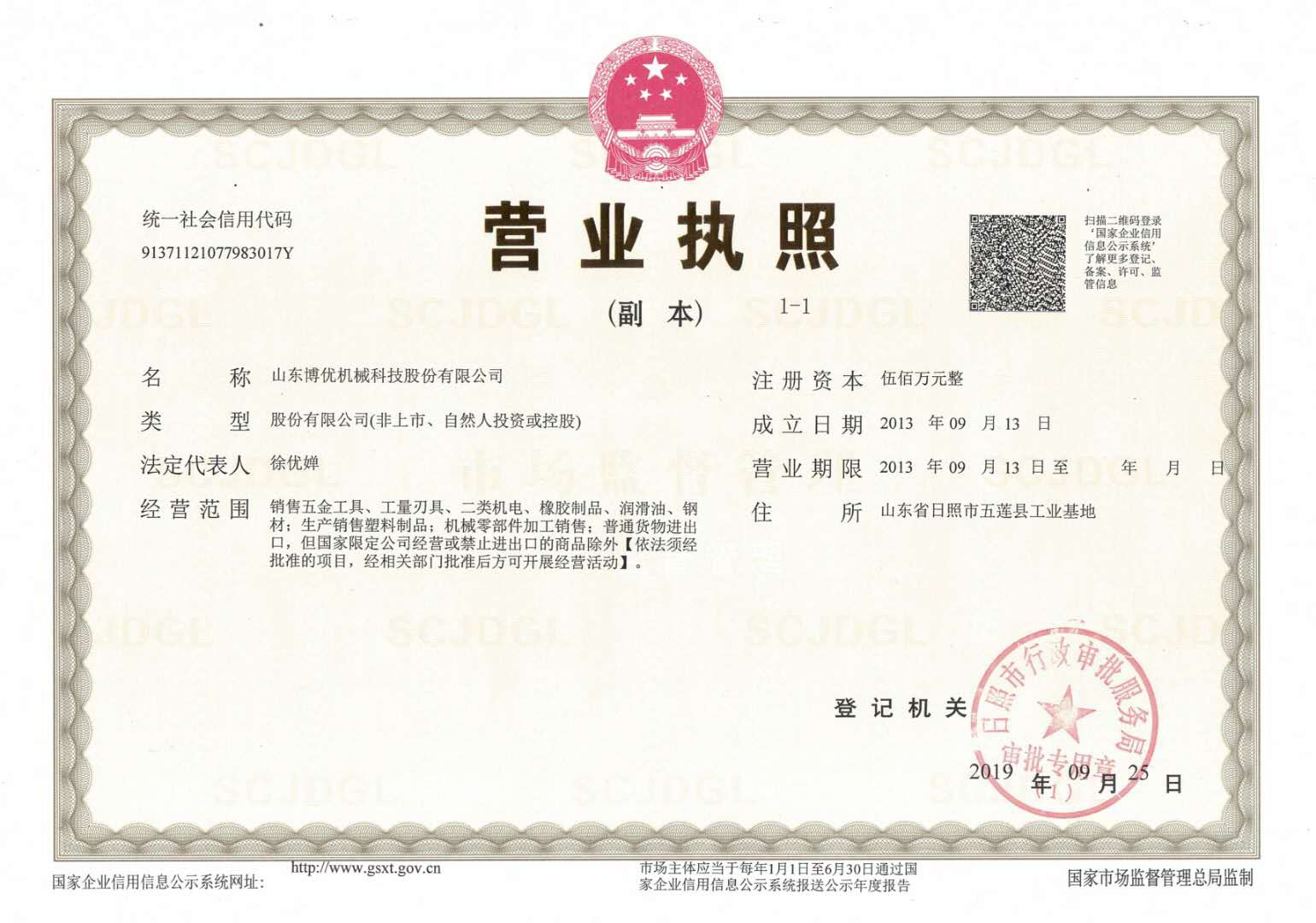 2017年1月公司重新注冊為山東博優機械科技股份有限公司,公司占地20畝,